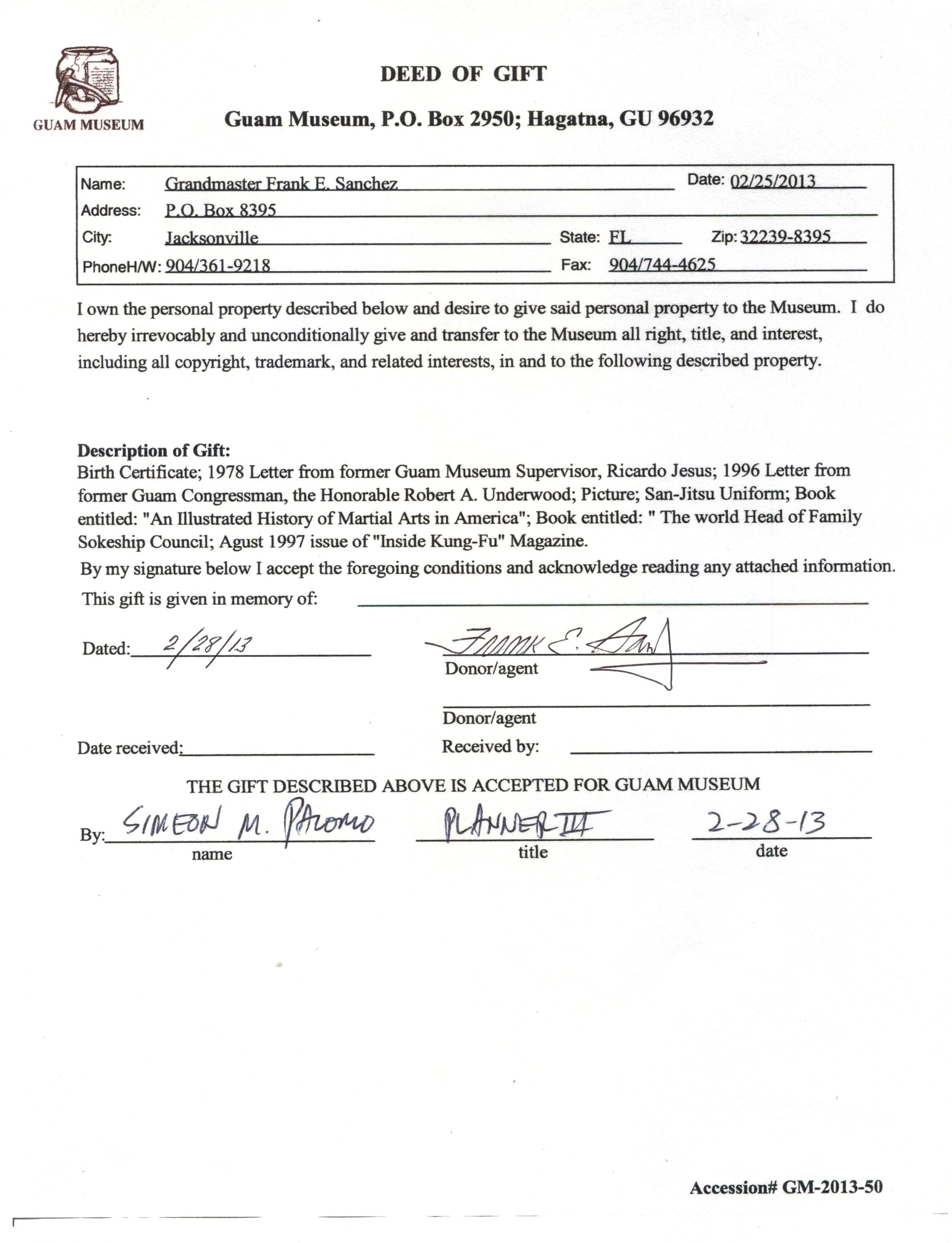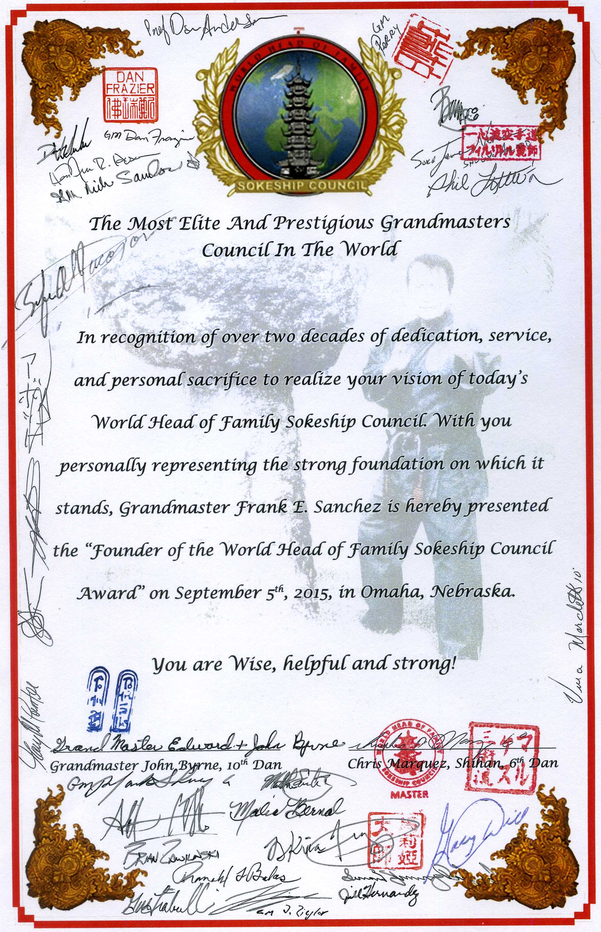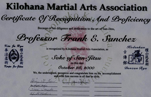 Certificate from Kilohana Association signed by legends of the martial arts, Great Grandmaster Ming Lum (deceased), Professor Imi Okazaki - Mullins (deceased - daughter of the Founder of Danzan Ryu Jiu-Jitsu, the late GM Henry Okazaki) & other respected Sensei