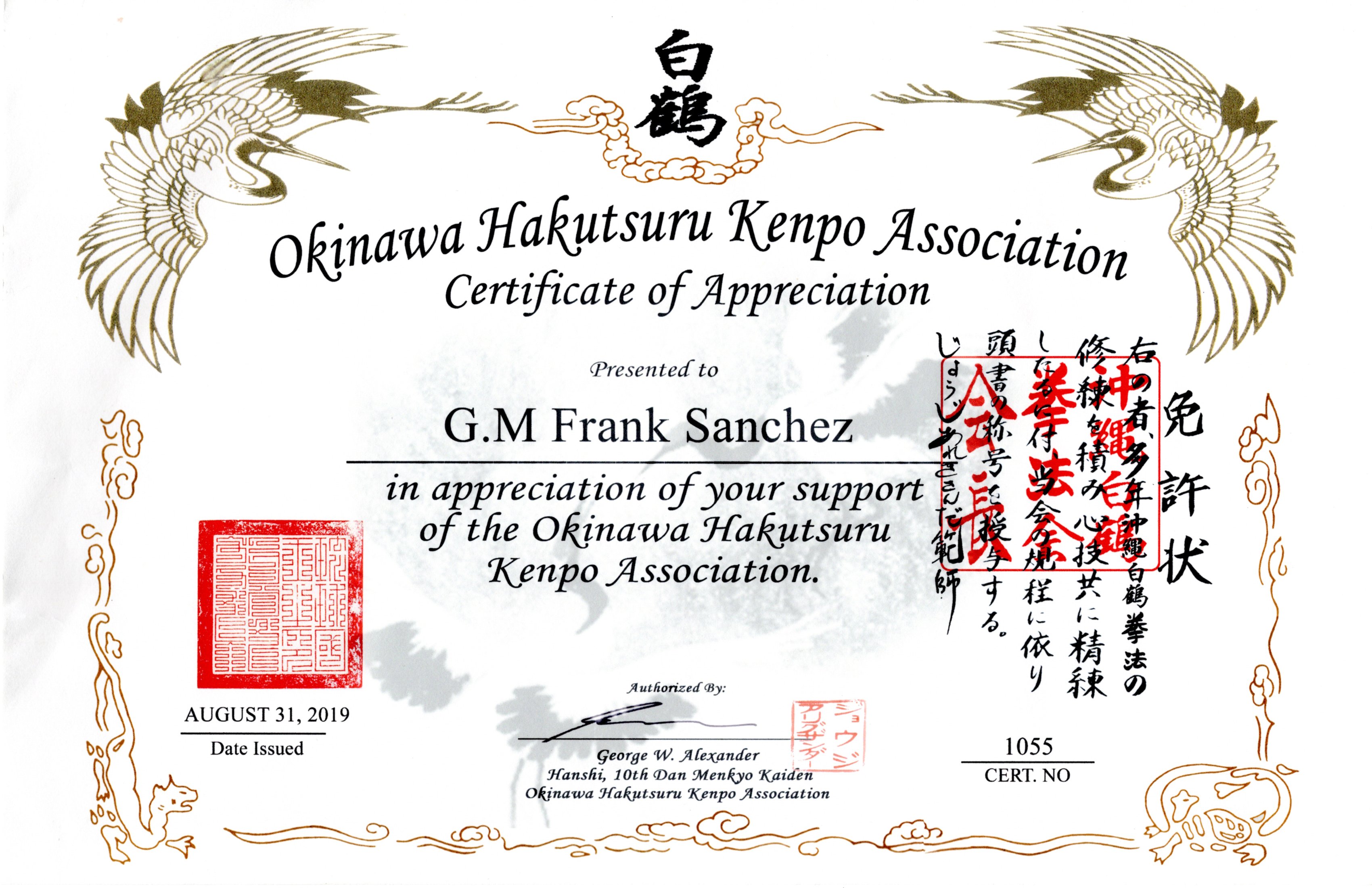 2019 Okinawa Hakutsuru Kenpo Assn. Cert. of Appreciation